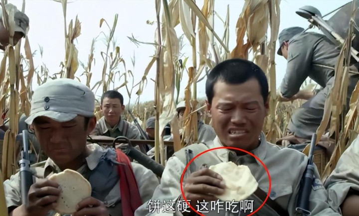 类似的例子也不止一个,比如在另一部抗战神剧里,女主角好不容易带领着队友冲出重围,原地休息时,每人发了一张白面饼,甚至拉近仔细看看,这张饼上面还撒了许多芝麻,就算是放到现在,也算是不错的吃食了,何况那个吃了上顿没下顿的战争年代